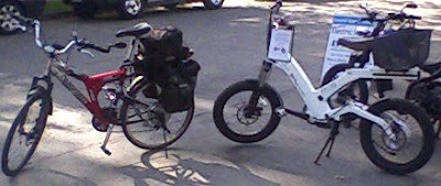 I've seen a couple of these A2B machines running around town. I finally spotted one on display at a scooter store. That's my electric bike parked next to it (videos of it in action found here and here). Some yahoo wanting to purchase an electric scooter to drive from his yacht at one end of a dock to the mailbox at the other end had waylaid the proprietor so I never got a chance to test ride it. You can find a video of a test ride done by the WSJ here.